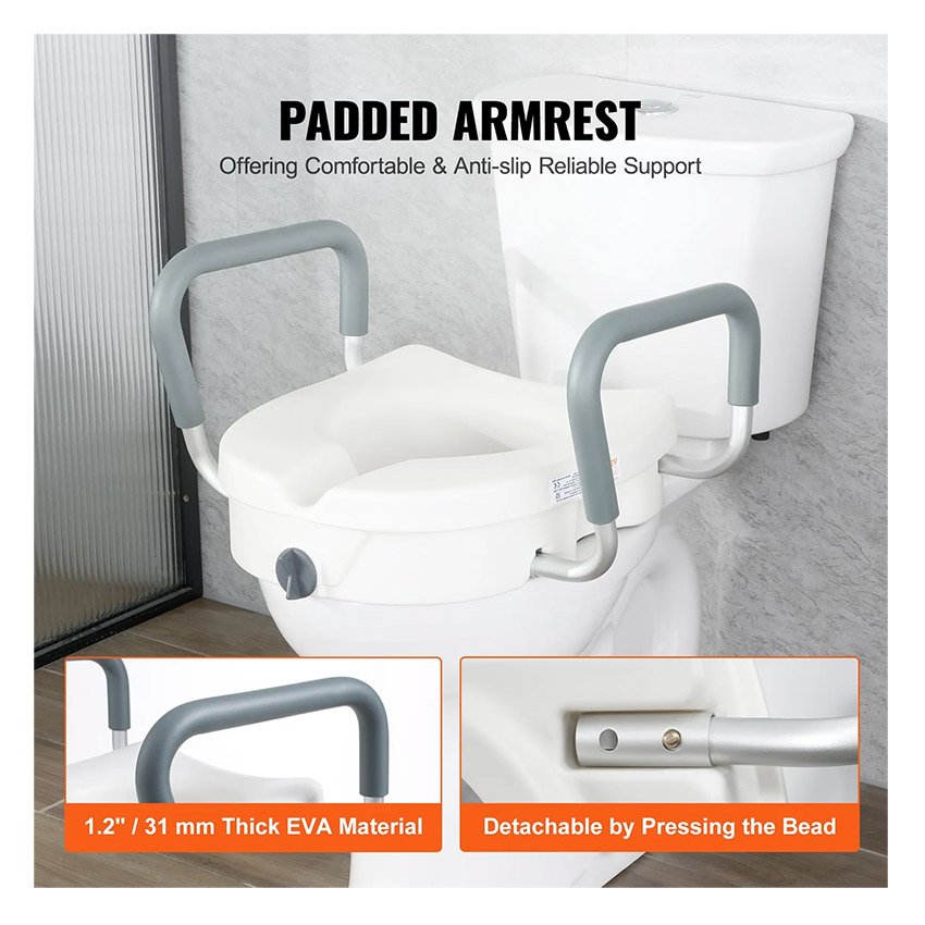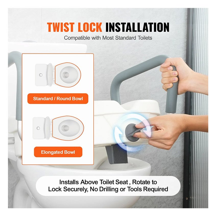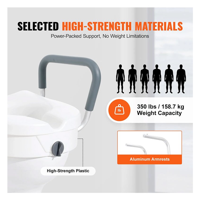 ✔ Matériaux et construction robustes : Fabriqué principalement en aluminium et en plastique haute résistance, ce rehausseur de toilettes est durable et supporte jusqu’à 159 kg, permettant ainsi à toute personne, quelle que soit sa morphologie, de l’utiliser en toute sécurité. De plus, il est facile à nettoyer.