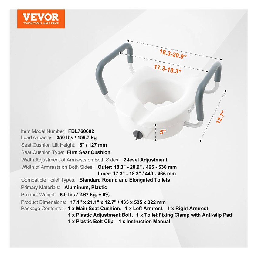 VEVOR Rehausseur de toilette, hauteur de 12,7 cm, supporte un poids de 158,8 kg pour toilettes rondes et allongées.