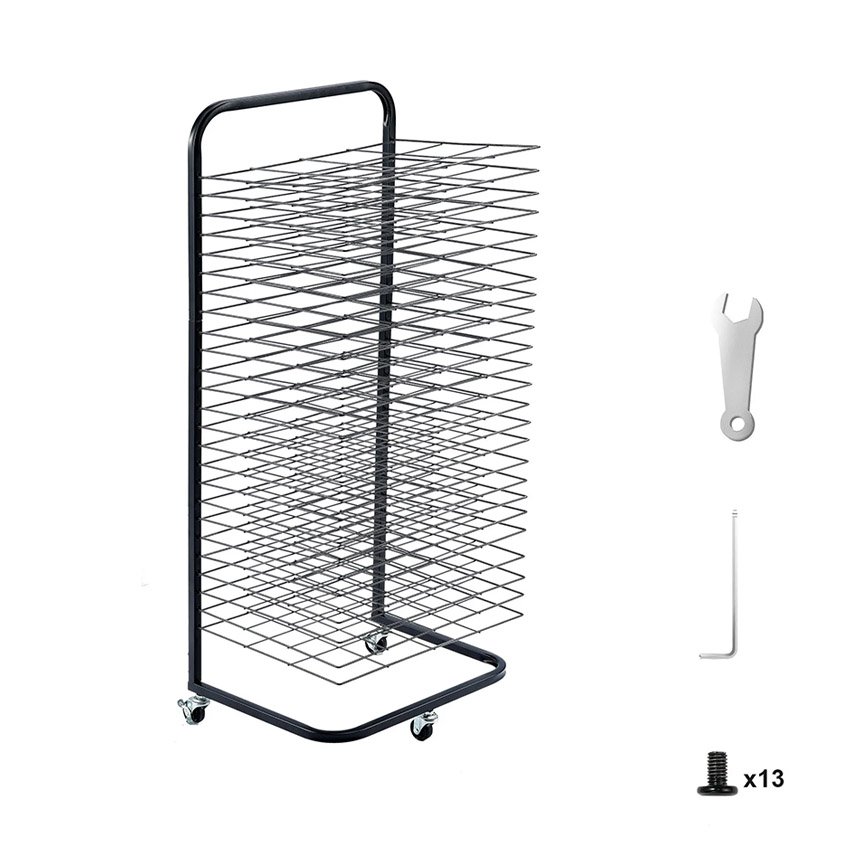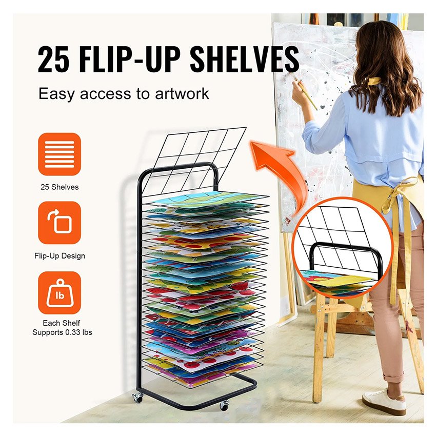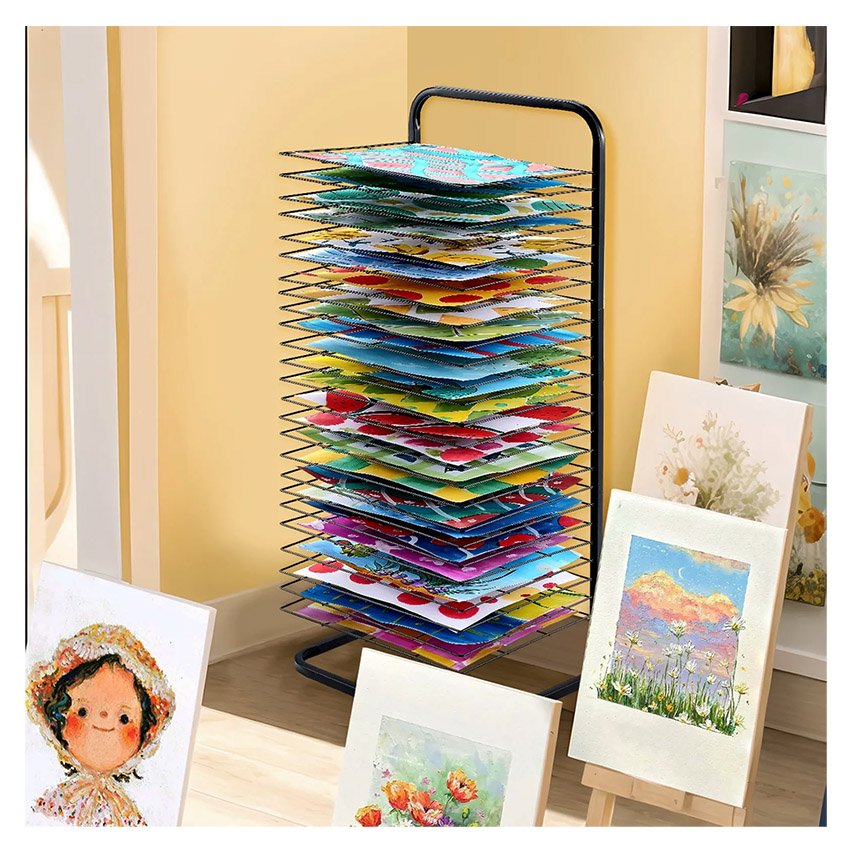 – Étagères amovibles : Doté de 25 étagères réglables, ce séchoir à peinture maximise l’espace de stockage et permet une insertion et un retrait faciles des œuvres d’art. Les étagères peuvent être soulevées pour un accès pratique, réduisant ainsi le risque de bavures sur les peintures humides. La finition de cuisson ajoute à sa durabilité et assure une expérience utilisateur fluide et confortable.