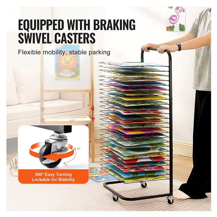 – Mobilité facile : équipé de 3 roulettes pivotantes, dont deux avec freins, ce séchoir à art pour salle de classe est facile à déplacer et à transporter. Il reste stable sans vaciller une fois positionné, ce qui le rend parfait pour ranger et sécher vos projets artistiques dans n’importe quel espace.
