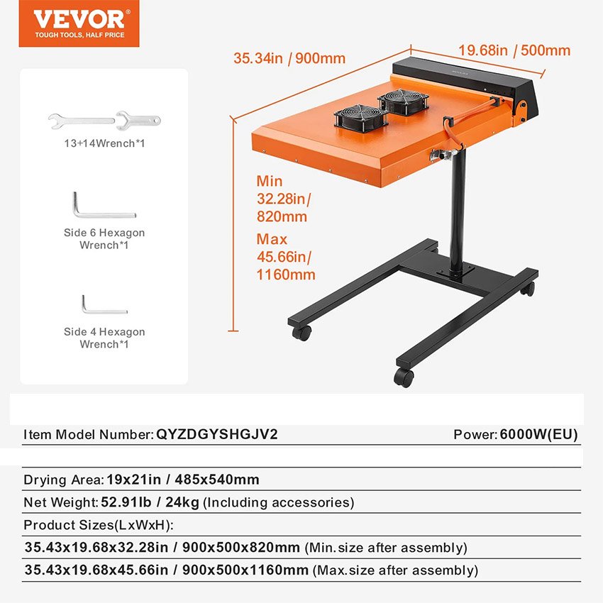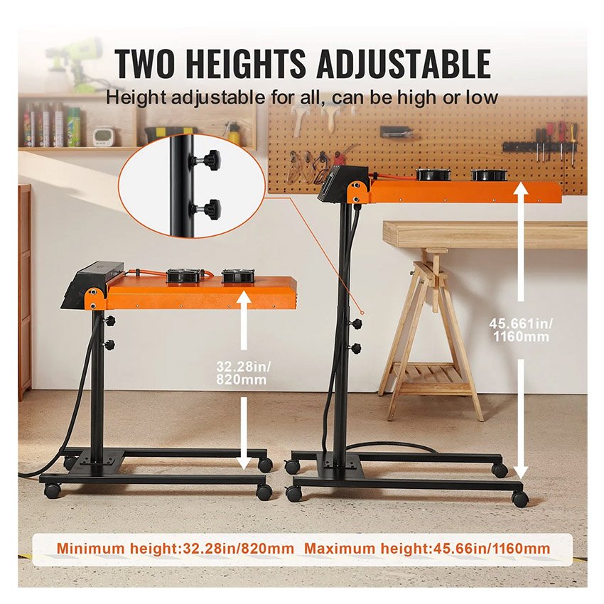– Hauteur réglable : dites adieu aux restrictions de hauteur ! Notre séchoir flash pour sérigraphie offre une hauteur réglable d’environ 32″ à 45″, pouvant accueillir facilement des utilisateurs de différentes hauteurs.
