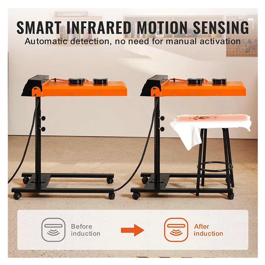 – Détection infrarouge : notre sèche-sérigraphie est équipé d’un capteur infrarouge sensible. Lorsque des vêtements sont détectés, la machine démarre automatiquement selon l’heure définie. Aucun démarrage manuel n’est requis, ce qui rend l’opération moins fastidieuse.
