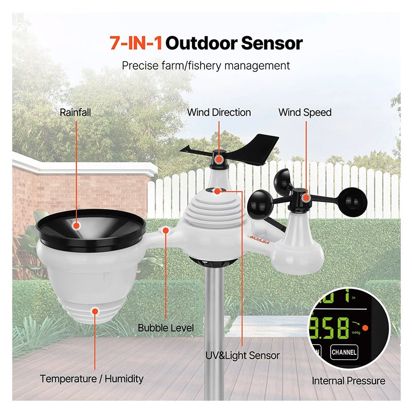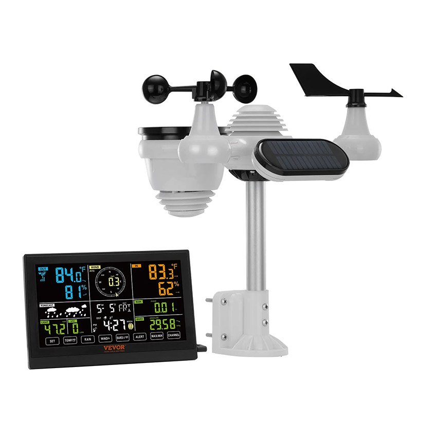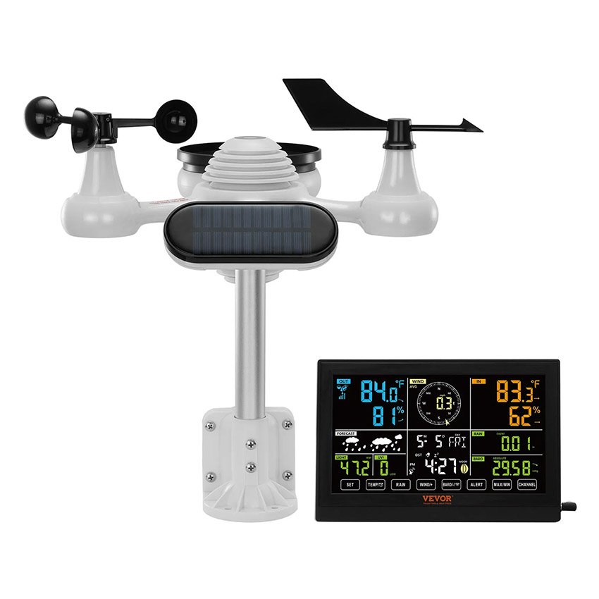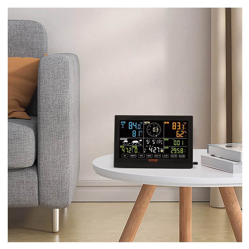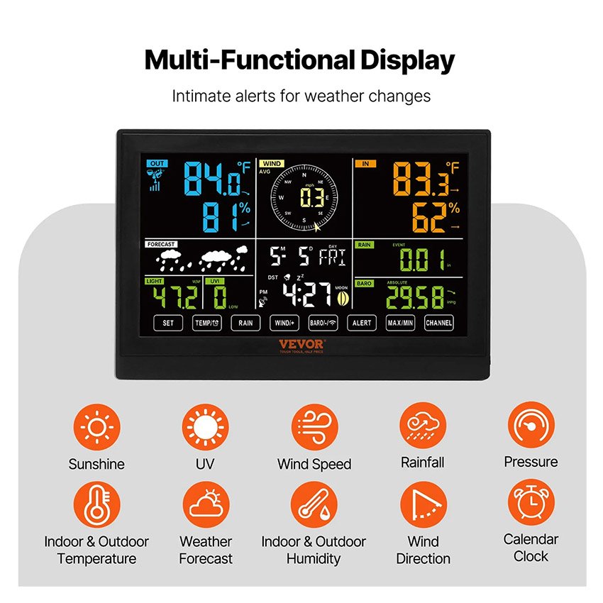 Station météo sans fil 7 en 1 Grand écran couleur de 19 cm Station météo numérique pour la maison l’intérieur et l’extérieur Mesure la température, l’humidité, la vitesse et la direction du vent, les précipitations et l’indice UV, avec prévisions, alarme et alertes VEVOR