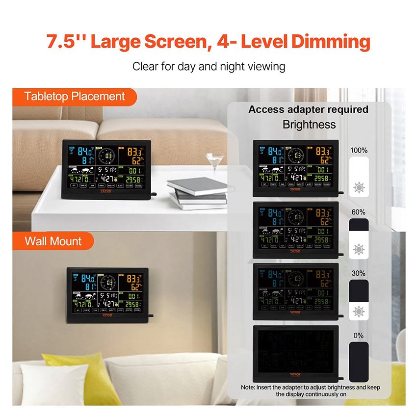 ✔ Grand écran de 7,5 pouces : Cette station météo solaire est équipée d’un grand écran de 7,5 pouces affichant clairement les prévisions et les données météorologiques. Elle propose 3 niveaux de luminosité pour une lecture facile de jour comme de nuit (adaptateur requis). De plus, la version Europe/États-Unis intègre une horloge atomique RCC, tandis que la version officielle pour le Royaume-Uni et l’Irlande est dotée d’une horloge atomique au format MSF.