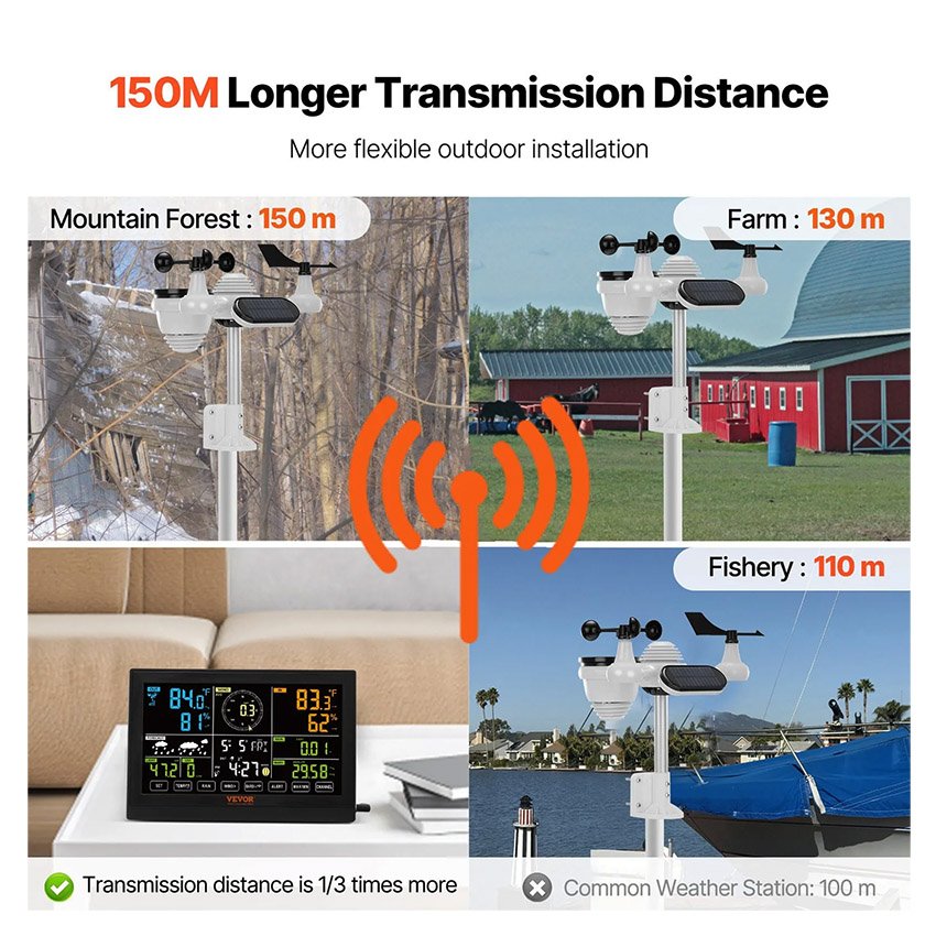 ✔ Portée de transmission de 150 m : La station météo sans fil possède une portée de transmission exceptionnelle de 150 m, vous permettant de disposer les capteurs en toute liberté pour une surveillance et une utilisation simplifiées. Elle est idéale pour les cheminées, les toits, les jardins et les exploitations agricoles. Veillez à éviter les téléviseurs, les antennes-relais, les lignes à haute tension et autres sources d’interférences.