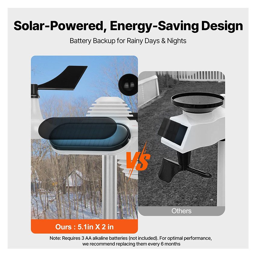 ✔ Amélioration de l’expérience utilisateur : La station météo domestique sans fil est équipée d’un panneau solaire de 50 x 100 mm. Ce panneau alimente l’appareil par temps ensoleillé, tandis que les batteries prennent le relais la nuit ou par temps nuageux, contribuant ainsi à réduire la consommation d’énergie. Le support de fixation en aluminium est robuste et résistant à la corrosion, assurant une longue durée de vie au capteur en extérieur
