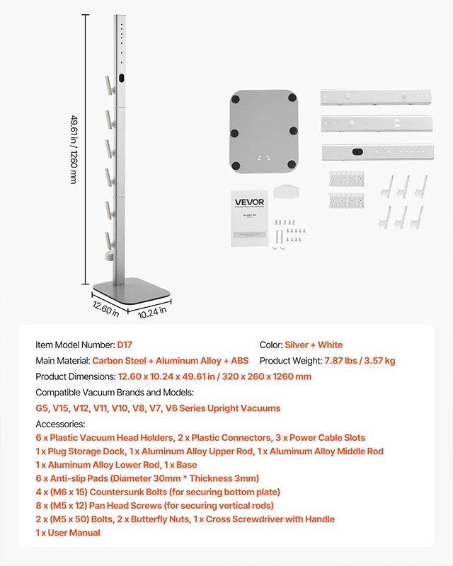 – Robuste et durable : Fabriqué en acier au carbone haute résistance, ce support d’aspirateur est doté d’une base lestée de 2,52 kg (5,55 lb) pour plus de stabilité. La base est équipée de patins antidérapants qui assurent un maintien parfait du support et l’empêchent de basculer ou de glisser