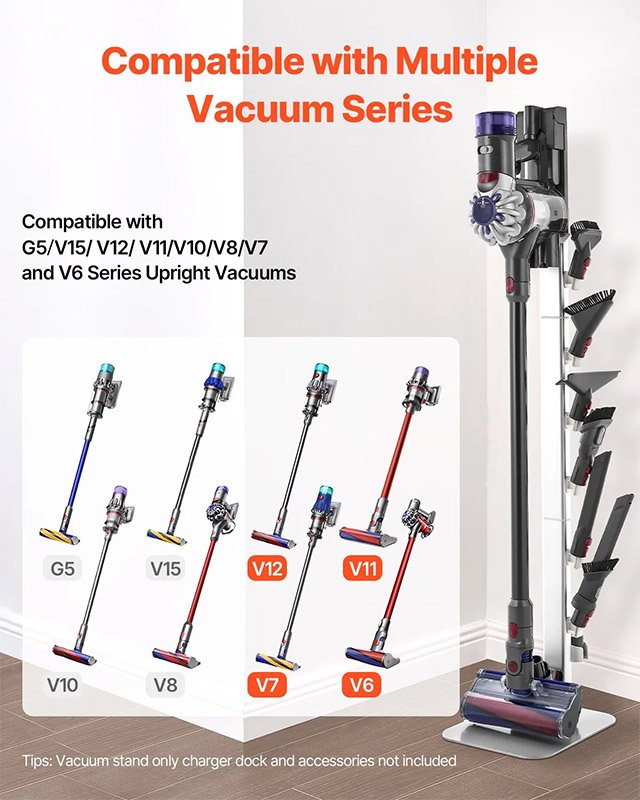 VEVOR Support d’Aspirateur pour Dyson G5, V15, V12, V11, V10, V8, V7, V6, Porte-aspirateur Vertical Rangement Stable avec Accessoires, 6 Crochets et Patins Antidérapants, pour Espaces Restreints, Gris