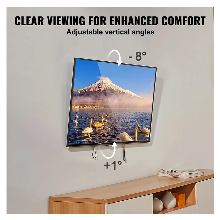 – Angles Réglables : Le support TV permet de régler l’angle avec une plage d’inclinaison de +1°/-8°, ce qui vous permet d’ajuster l’angle en fonction de vos besoins de visualisation. Réduisez les reflets et profitez d’une expérience visuelle plus claire à votre convenance.