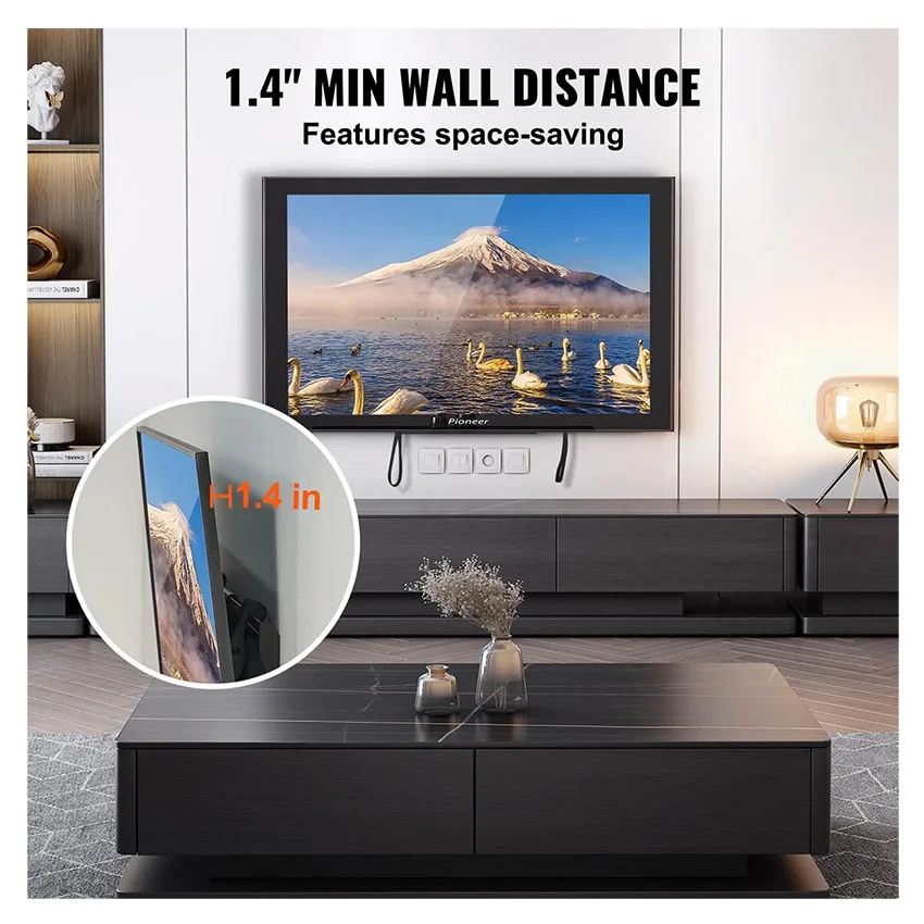 – Conception Peu Encombrante : Notre support mural fixe pour téléviseur présente une distance d’installation de 35 mm par rapport au mur, ce qui permet d’économiser l’espace d’installation. Nous fournissons également du velcro pour une gestion pratique des câbles, afin que tout soit bien rangé et organisé.