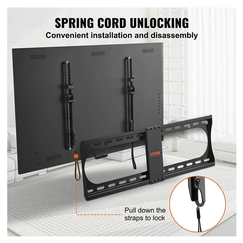 – Installation Facile : Nous fournissons un ensemble complet d’accessoires d’installation, comprenant des vis, un niveau à bulle et du velcro. Il suffit d’utiliser les outils pour une installation par une seule personne en 30 minutes. Grâce à un mécanisme de déverrouillage à corde à ressort, le retrait et le démontage de votre téléviseur sont faciles.