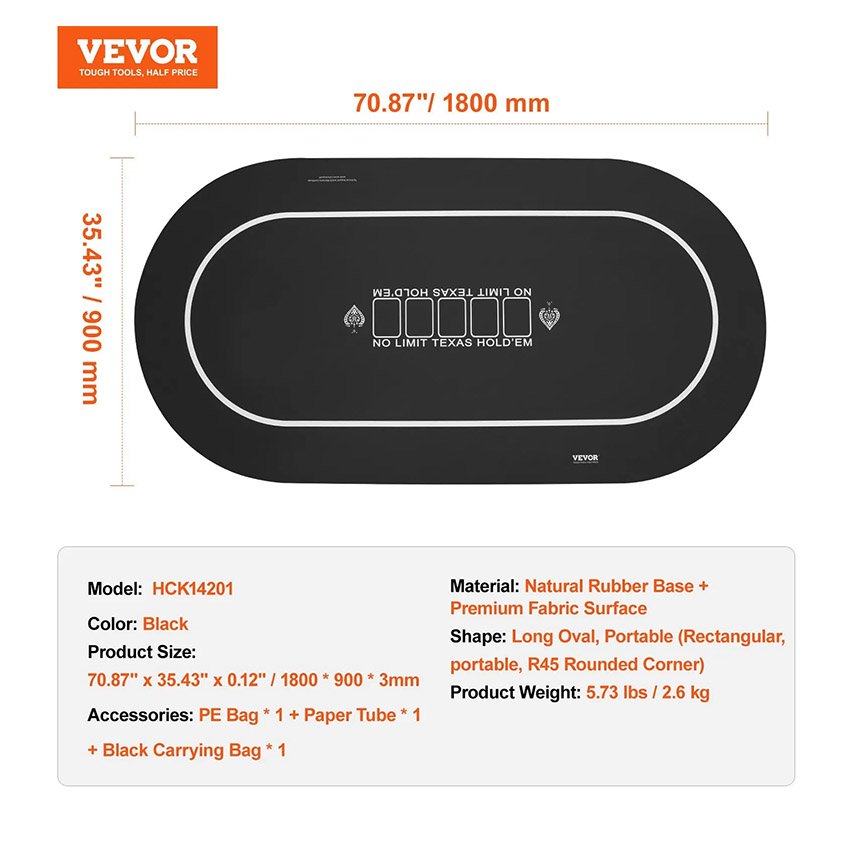 VEVOR Tapis de poker 177,8 x 88,9 cm 6 à 8 joueurs pliable avec sac de transport