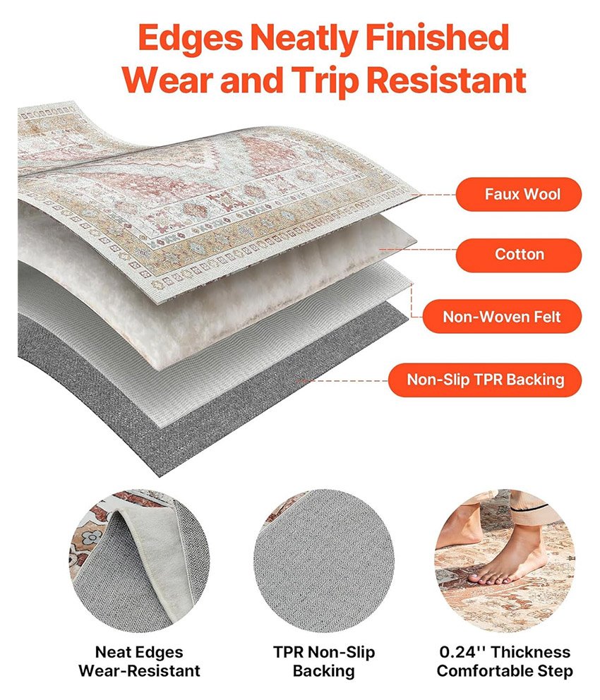 – Lavable en machine : Un envers antidérapant en TPR et une bordure en faux cachemire. Résiste au lavage en machine. Nous vous recommandons d’éviter l’utilisation prolongée d’aspirateurs robots puissants pour préserver l’état impeccable du tapis