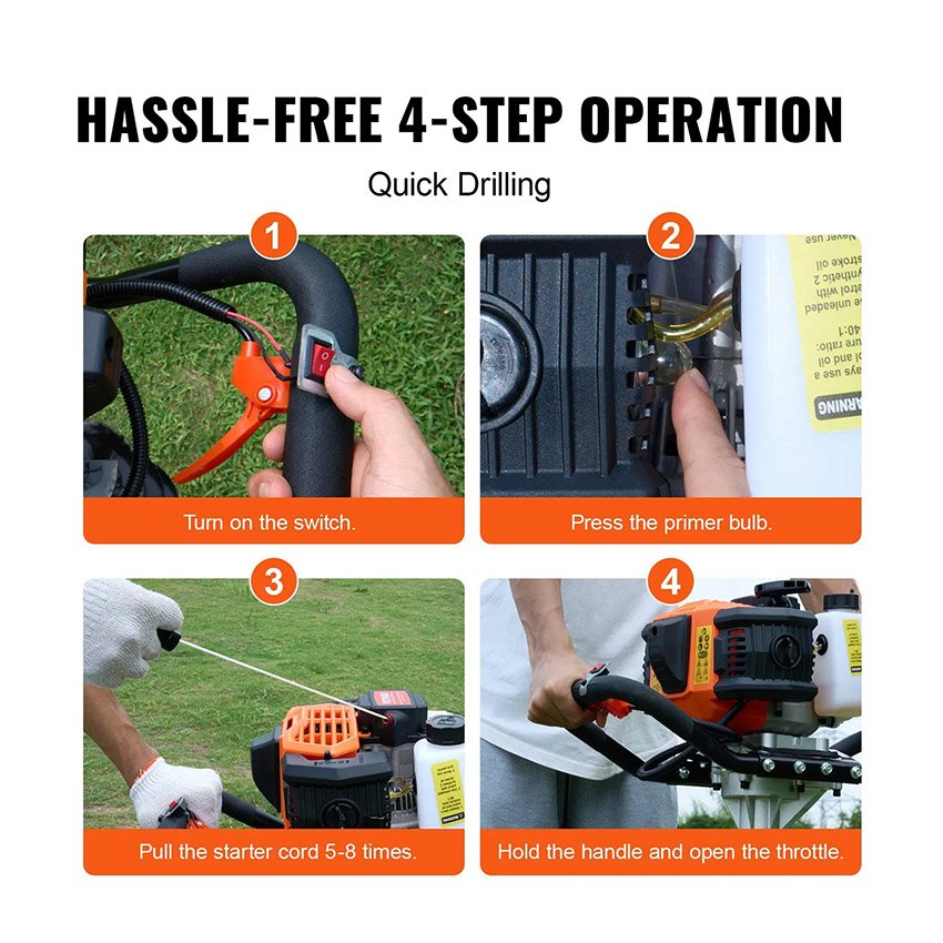 – Démarrage rapide : Équipé d’un bidon d’huile de grande capacité de 1,2 L, vous pouvez simplement utiliser le bidon d’huile pour le dosage, le rapport de mélange d’huile moteur à essence est de 40:1, la tarière à essence adopte une corde de traction épaissie, qui est plus durable que la corde de traction ordinaire, vous pouvez démarrer la tarière à carburant en seulement 4 étapes simples.
