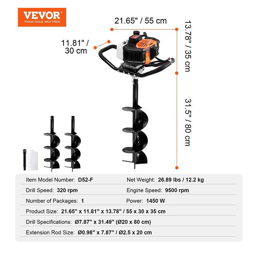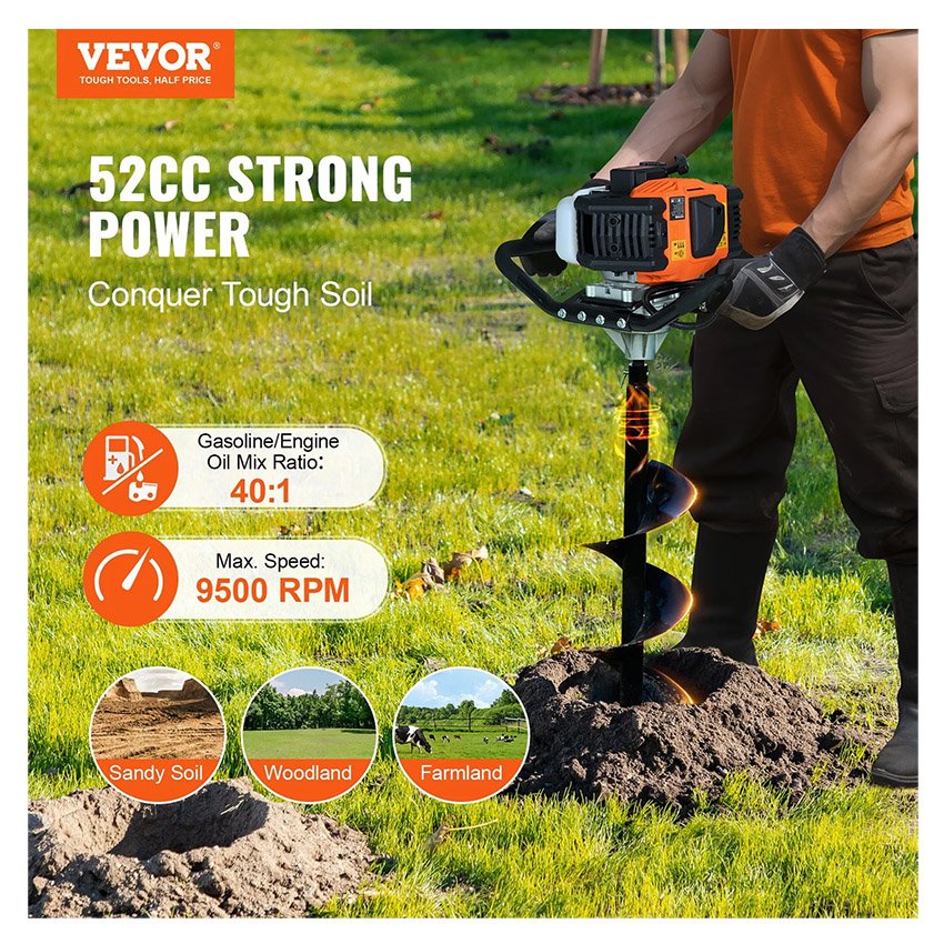 – Puissance puissante : Équipé d’un moteur à essence de 52 cc, la puissance de la tarière thermique est jusqu’à 1450 W, la vitesse de rotation peut atteindre 9500 tr/min et le foret tourne jusqu’à 320 tr/min, combiné à la forte puissance du moteur, il peut terminer la tâche de forage rapidement et peut facilement faire face à toutes sortes de conditions de sol et de terrain, ce qui convient aux exigences de travail intensif.