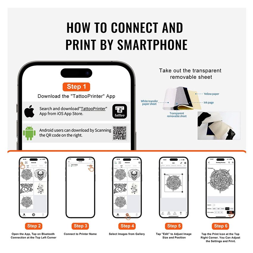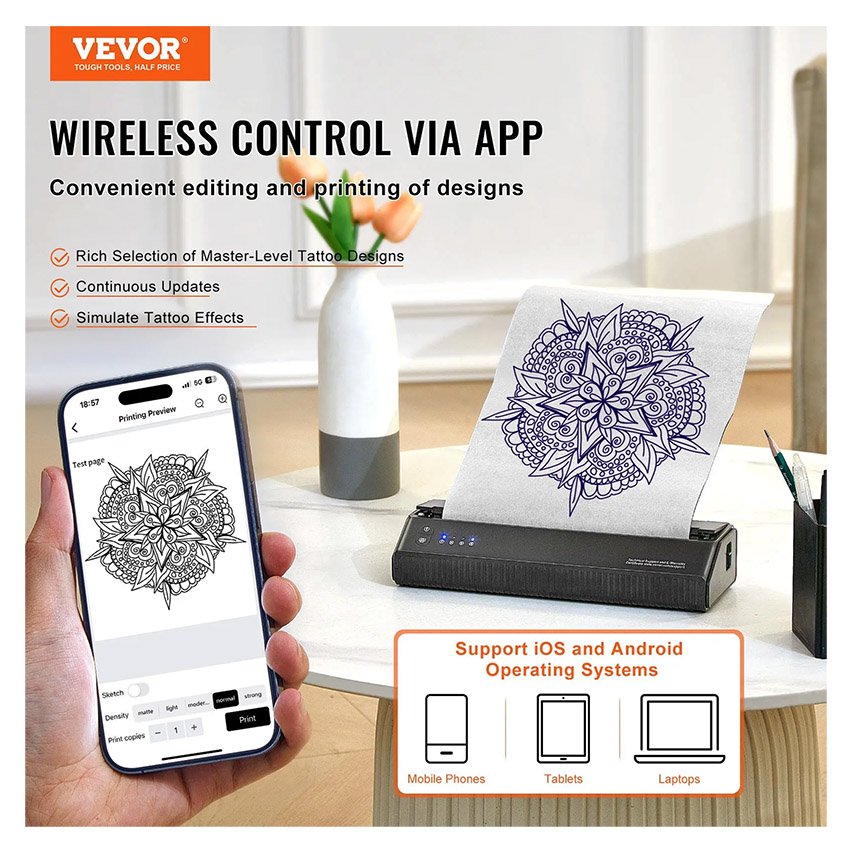 – Contrôle de l’application : explorez différents styles et thèmes avec la bibliothèque de conception de tatouage de niveau maître de l’application. Notre imprimante de pochoirs de transfert de tatouage vous permet d’imprimer des motifs de tatouage à partir de la galerie de votre téléphone, d’ajuster les tailles ou de libérer votre créativité avec des outils de pinceau et de texte pour répondre à vos besoins personnalisés.