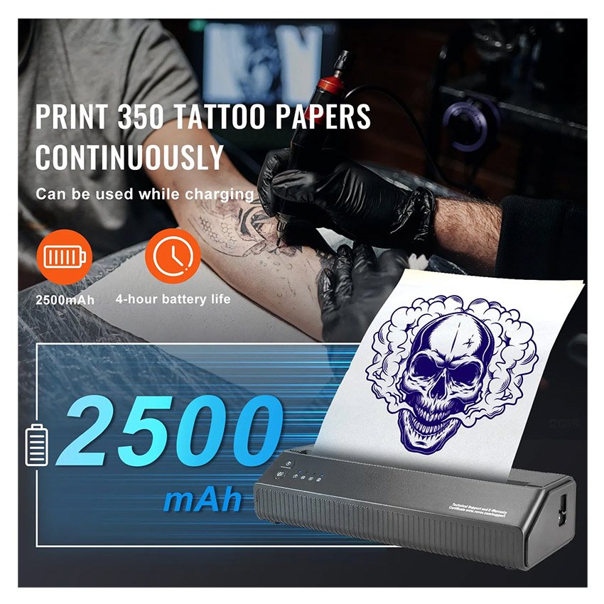 – Batterie puissante : équipée d’une batterie de 2 500 mAh, notre imprimante de tatouage peut imprimer en continu jusqu’à 350 papiers de tatouage sur une seule charge, éliminant ainsi le besoin de recharges fréquentes. Utilisez-le dans divers environnements de travail, y compris à l’extérieur ou dans des espaces de travail temporaires, en toute confiance.