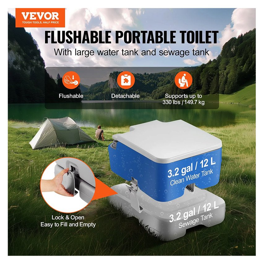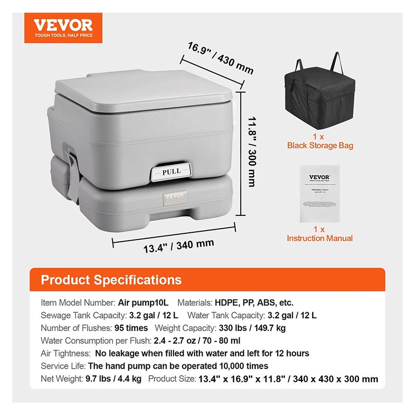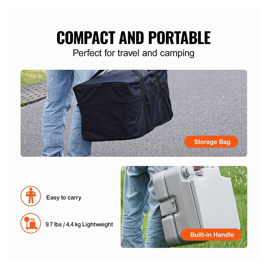 Toilettes portables VEVOR pour le camping avec sac de transport, toilettes pour camping-car avec réservoir à déchets de 12 litres, chasse d’eau sous pression par bouton-poussoir, toilettes de voyage étanches et sans odeur pour adultes et enfants en camping-car