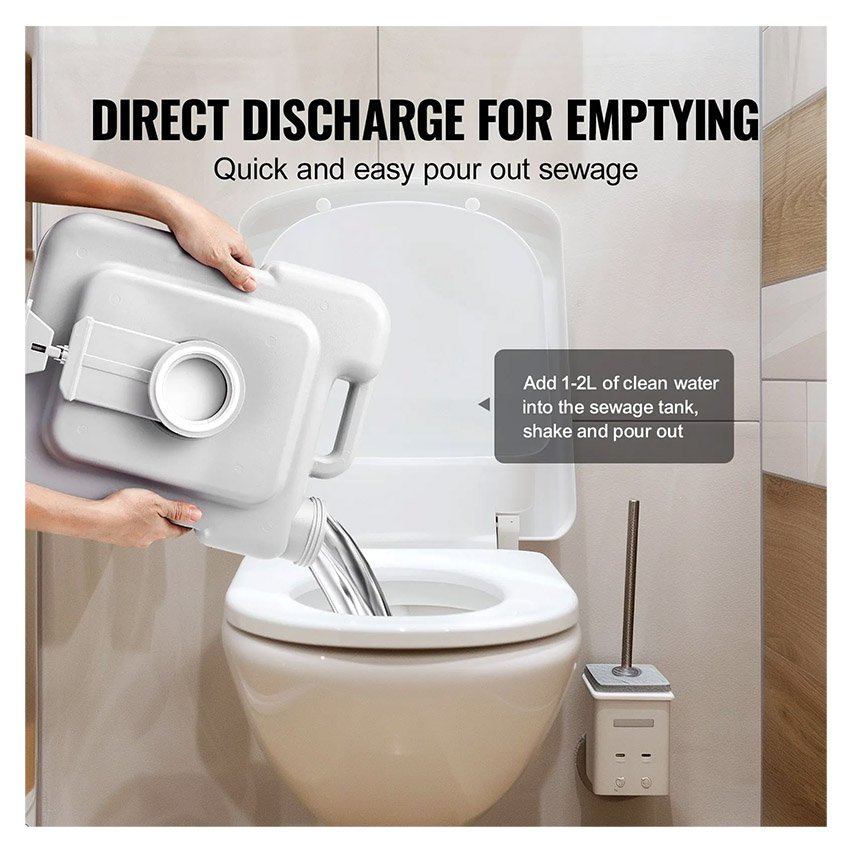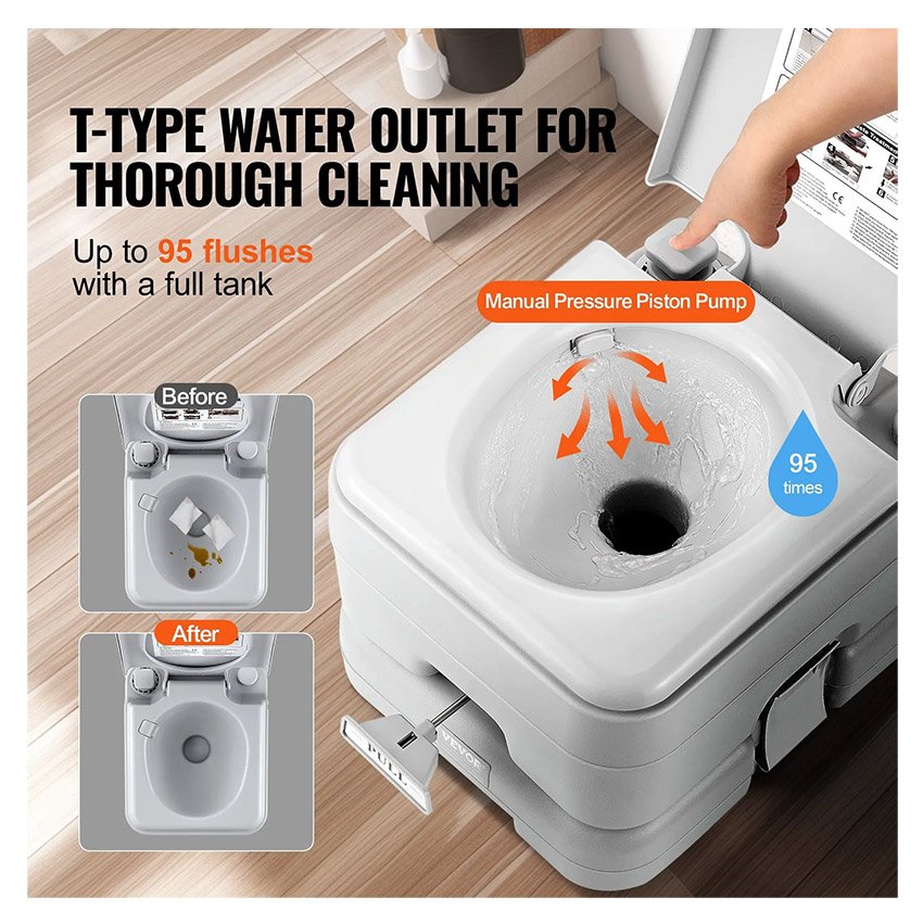 – Chasse d’eau sous pression jusqu’à 95 fois : Ces toilettes de voyage sont équipées d’un réservoir de 10 litres (2,6 gal) avec une pompe à piston manuelle pour une chasse d’eau sous pression, utilisant 100 à 105 ml (3,4 à 3,6 oz) par chasse pour une évacuation rapide et efficace. La conception de la sortie d’eau en T à couverture intégrale assure un nettoyage rapide à 360° pour une hygiène optimale.