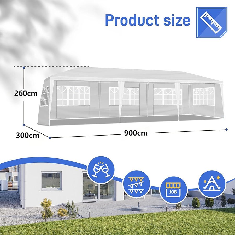 Tonnelle de Jardin 3x9m avec 8 Parois latérales Amovibles Protection UV 50+ imperméable Barnum Stable et résistant Gazebo de Jardin pour marchés Festivals Camping Mariages Blanc