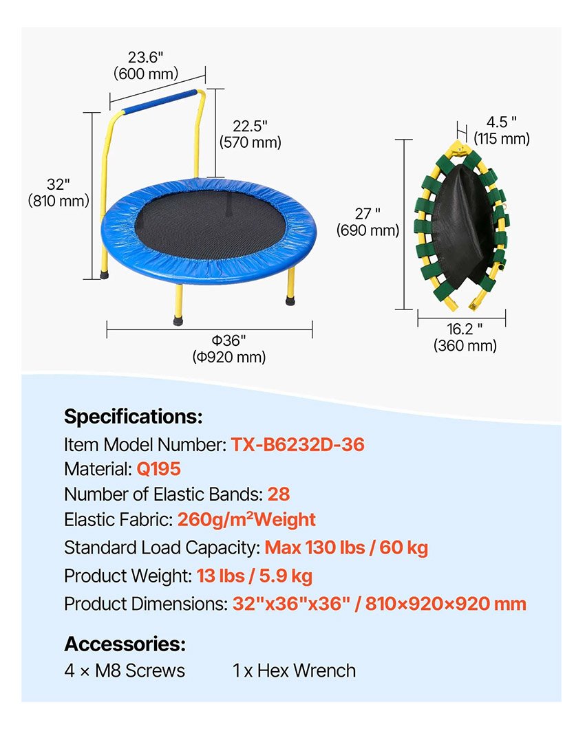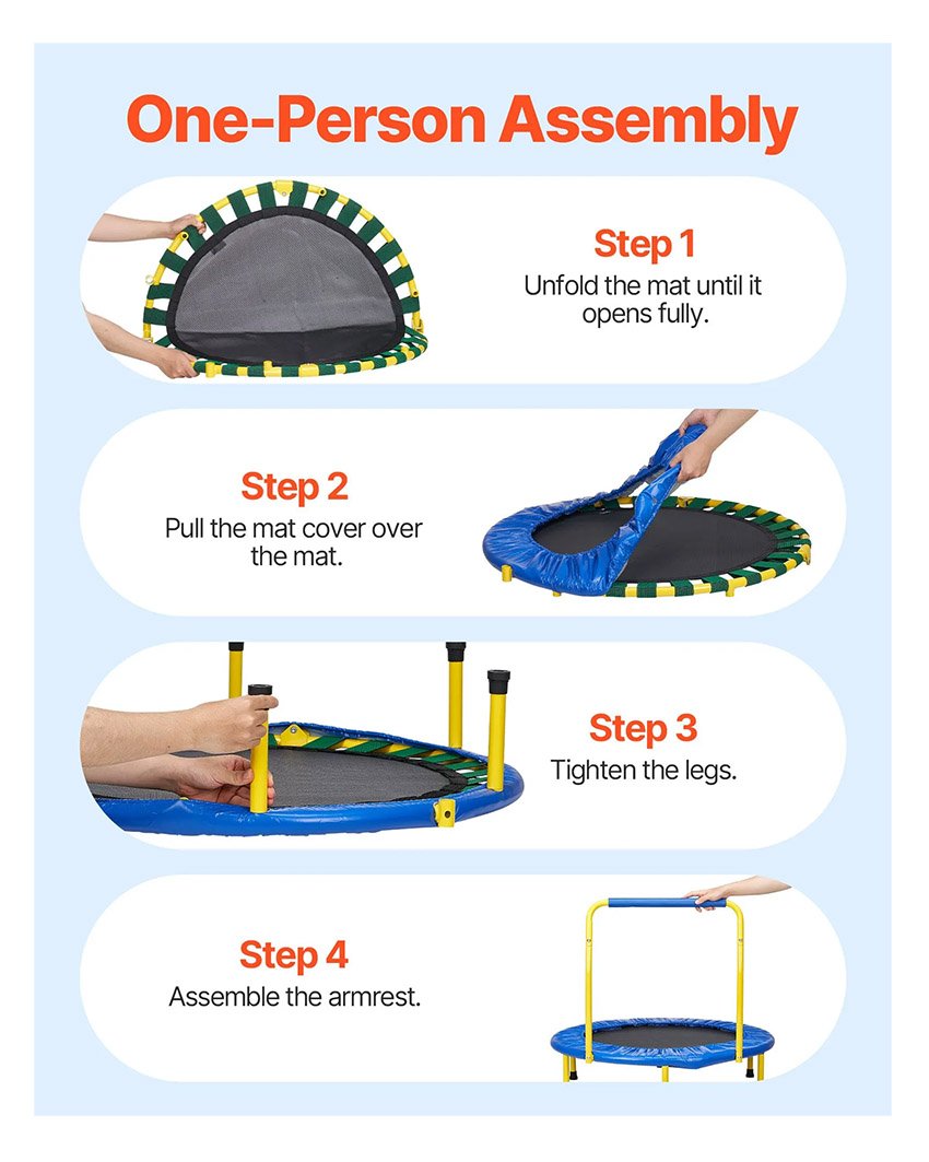 – Assemblage Rapide : L’assemblage du mini trampoline pour tout-petit est un jeu d’enfant et ne nécessite qu’un seul adulte. Suivez les instructions pour assembler le cadre, serrez les pieds, connectez le tapis au cadre et fixez-le avec des trous et des filetages précis.