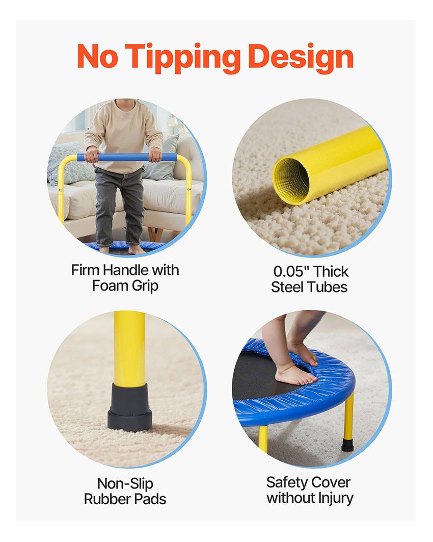 – Robuste, Stable, Sécurisé : Notre trampoline pour tout-petits est doté d’une structure entièrement en acier avec un revêtement amélioré, résistant à la flexion et à la déformation. La poignée en mousse protège les mains et permet une utilisation confortable. Les pieds en caoutchouc évitent de glisser et réduisent le bruit. Le tapis en PP imperméable est facile à nettoyer, ce qui facilite l’entretien.