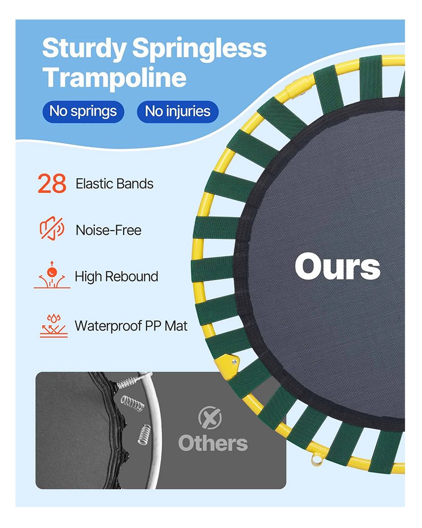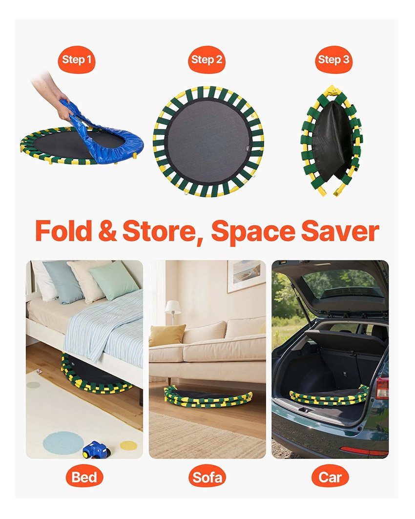 – Pliable pour un Rangement Facile : Le trampoline d’exercice pour enfants peut être plié en seulement 3 secondes, économisant de l’espace et se plaçant facilement sous un canapé ou dans un coffre de voiture. Sa conception pliable le rend portable, permettant aux enfants de rebondir où bon leur semble.