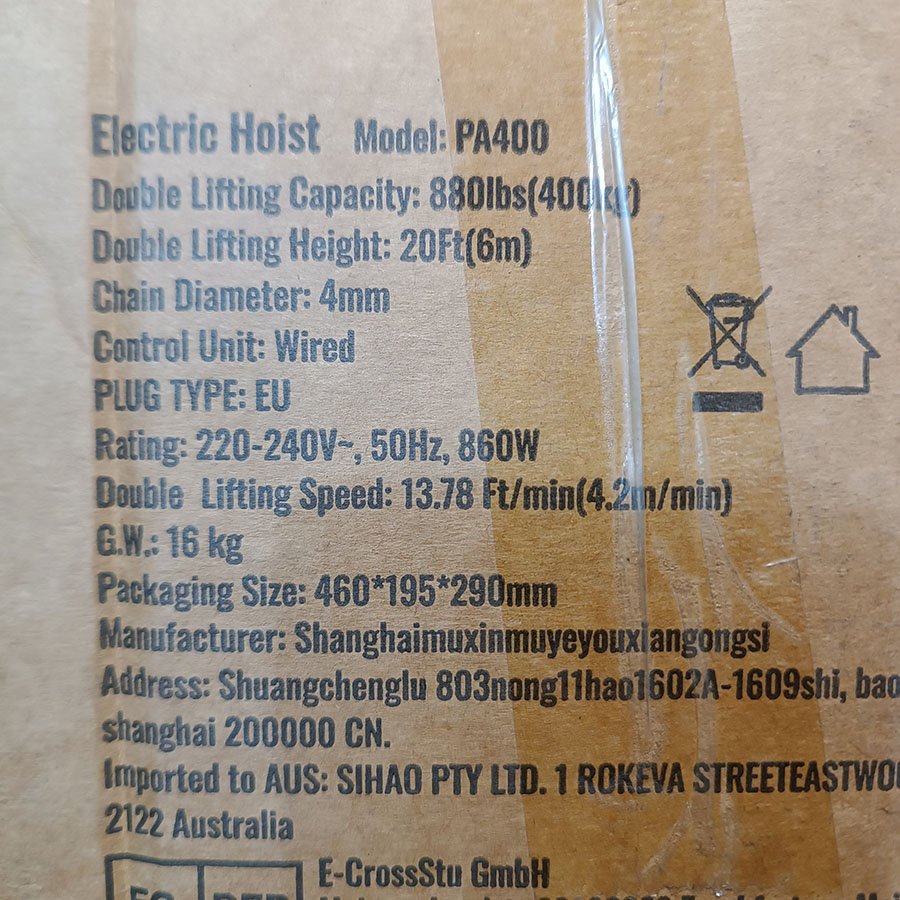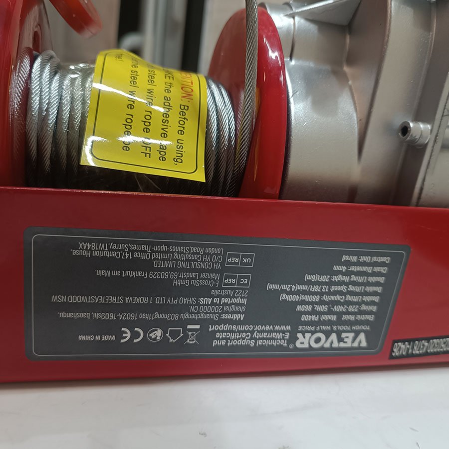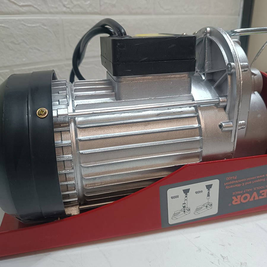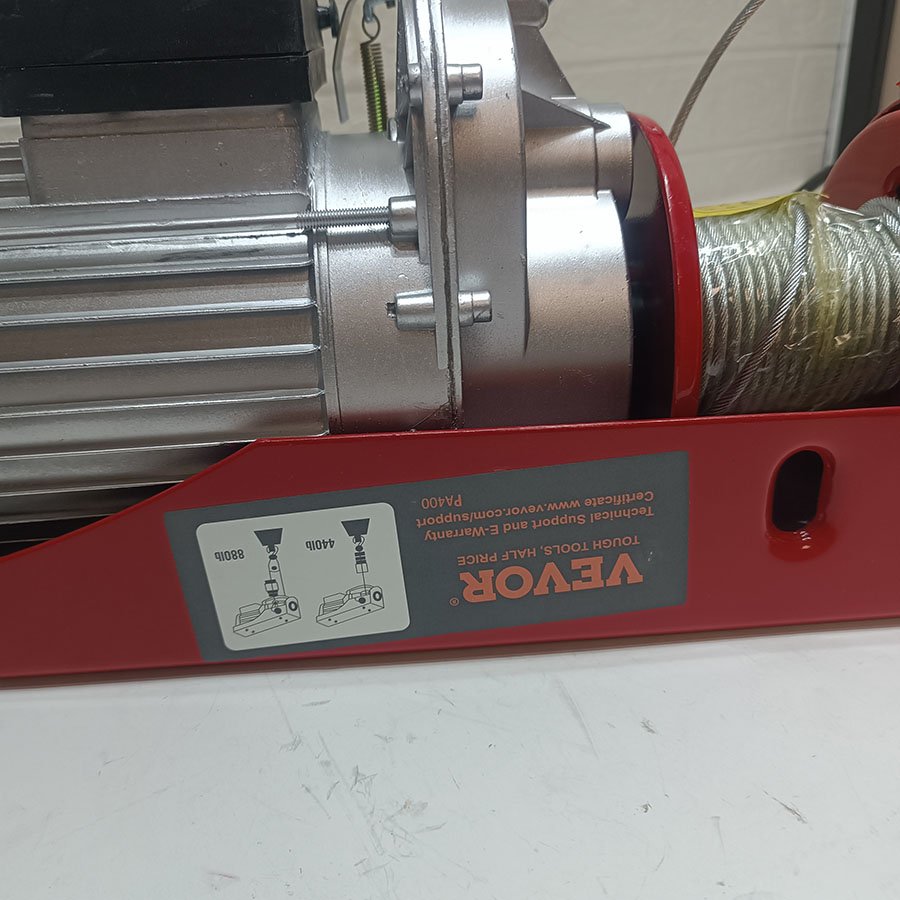 – Capacité de levage : 400 kg (880 lb) : ce palan électrique permet de soulever facilement de petits moteurs, des réducteurs, de gros outils d’atelier ou des matériaux de construction. Capacité de levage : 200 kg (440 lb) (câble simple), 400 kg (880 lb) (câble double).