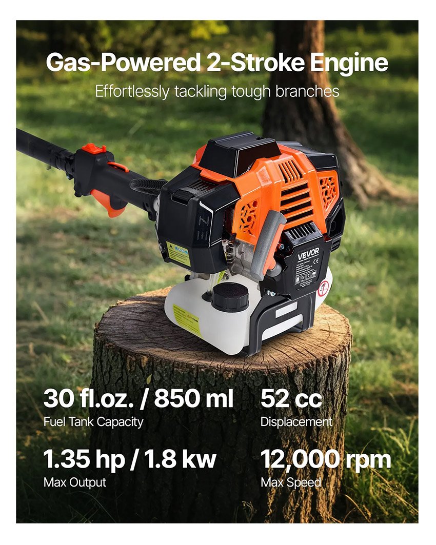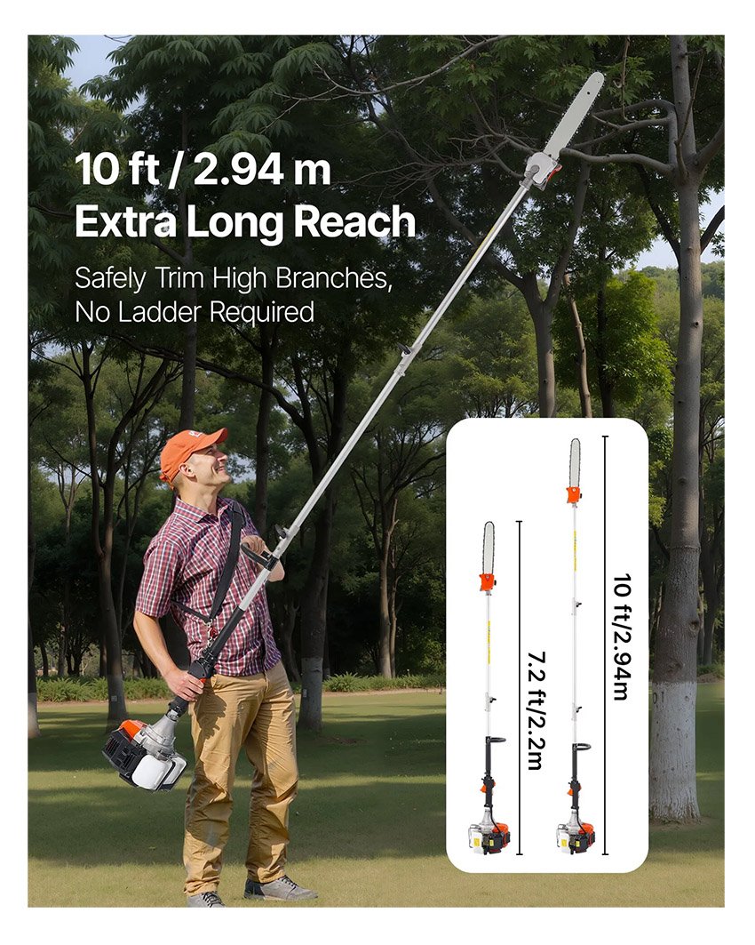 – Performances exceptionnelles : Équipée d’un moteur à essence 2 temps de 52 cm³, cette élagueuse sur perche thermique développe une puissance de 1,35 ch et atteint une vitesse de 12 000 tr/min, idéale pour une coupe rapide des branches. Ses deux rallonges de 85,5 cm (33,7 po) permettent d’atteindre des branches de différentes hauteurs, de 2,2 m (7,2 pi) à 2,94 m (10 pi).