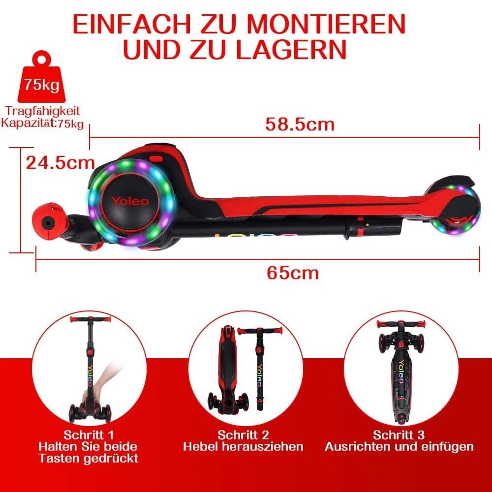 – Hauteur réglable : Le guidon peut être réglé en 4 hauteurs différentes de 61 cm à 81 cm, ce qui convient très bien aux enfants de 3 à 12 ans. Et le design facile à plier le rend très approprié pour le stockage et le transport rapides, très bon pour les sorties ou les voyages. Yoleo Roller est un bon cadeau pour les enfants, il peut grandir avec les enfants et accompagner toute l’enfance.